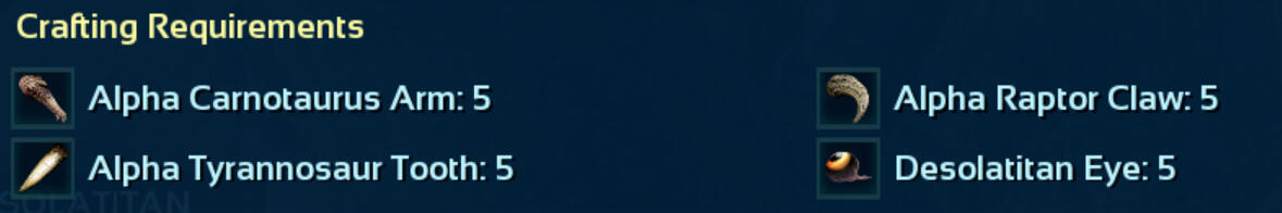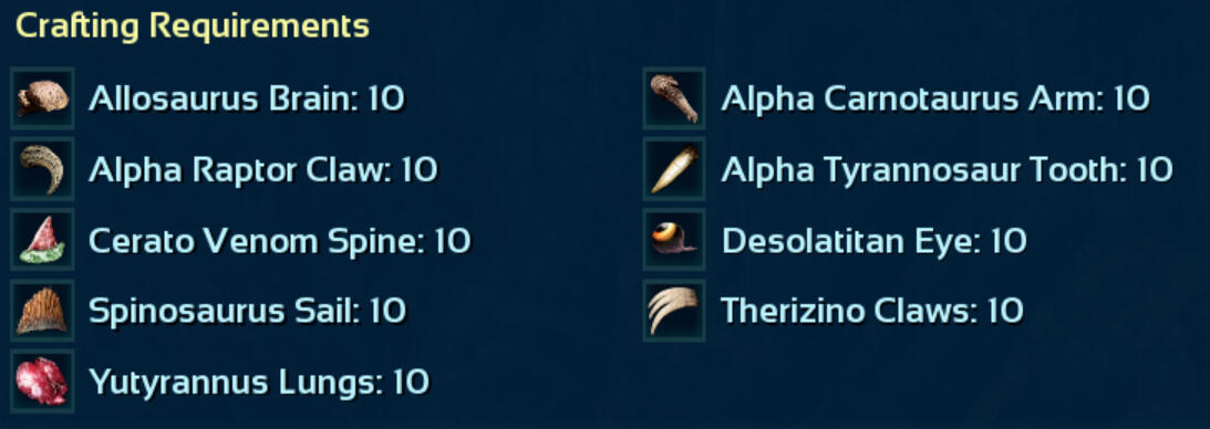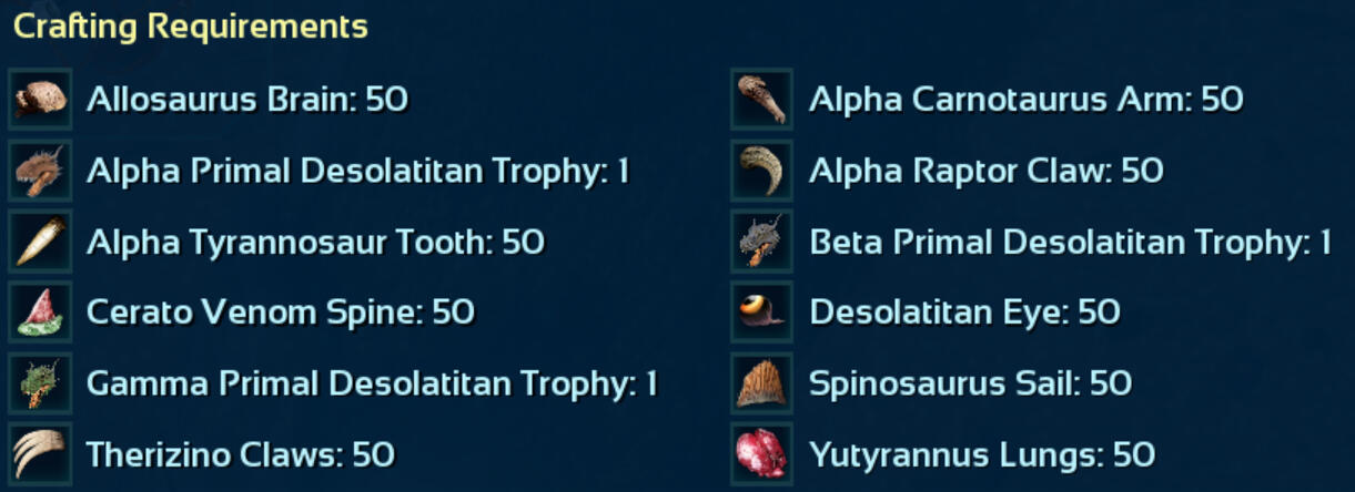 The Alpha Sulfur titan also drops many blueprints and saddles, a large amount of Crystalized Sulfur, and 300 Element.